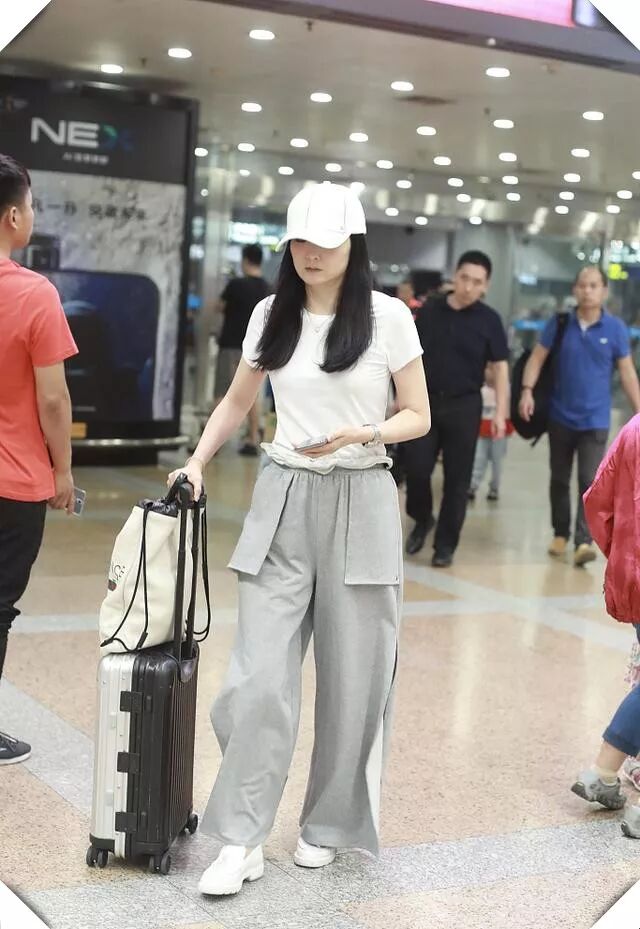 白色的鸭舌帽让她的脸看起来更加小巧了,穿着白色的T恤很简单大方,灰色的运动阔腿裤看起来很舒适的样子,还是一双小白鞋,很干净的一身呢,小白鞋真是百搭的单品呢,她这一身灰色和白色的搭配既简单又高级呢,很适合她贵妇的人设呢。