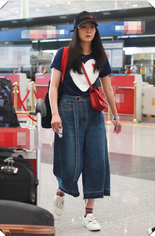 长发披肩的王艳带着一顶黑色的鸭舌帽,这个鸭舌帽上面还有一颗红色的小心心,很可爱呢,一件黑色的T恤上面也有一颗白色的大心心呢,蓝色的裙裤穿在身上,有一丝俏皮呢,搭配一双小白鞋,这一身真是青春呀斜挎一个红色的小包包,艳丽的红色正如她的名字一般呢,很艳丽。