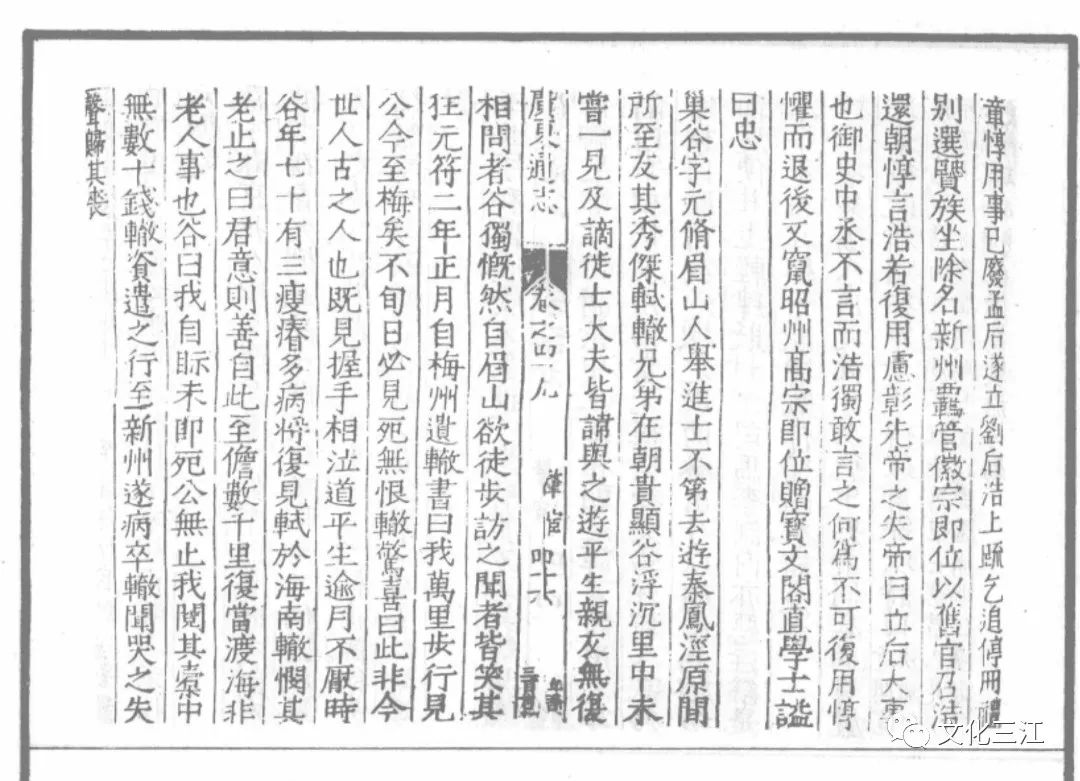 也就是说,北宋时有一个名叫巢谷、字元修的人,是眉山人(与苏轼、苏辙兄弟是老乡),参加科举考试不第,就到秦凤、泾原一带游览,每到一个地方都能与当地秀士俊杰为友;当时,苏轼、苏辙在朝为官,非常显贵,而巢谷则浮沉于乡里之间,他们未尝能见一面;及至后来二苏兄弟因为政治风波被贬谪、流徙,所有士大夫都很忌讳和他们交往,平生亲友也没有来慰问的,这时唯独巢谷慨然自眉山老家想徒步探访他们,听到(巢谷想法)的人都笑他癫狂;元符二年正月,巢谷到达梅州,给当时谪居循州的苏辙写去书信,言“我万里步行见公,今至梅矣,不寻日必见,死无恨”,苏辙见到书信后,又惊又喜,赞叹道“此非今世人,古之人也”;后来,巢谷和苏辙如愿相见,二人握手相泣,尽道平生,过了一个月也不觉得厌倦;这时,巢谷已经七十三岁高龄,身瘦多病,但他还打算继续起程到海南去探望被贬谪到那里的苏轼,苏辙怜悯他年老,打算制止他,说“君意则善,自此至儋数千里,复当渡海,非老人事也”,但巢谷去意坚定,对苏辙说“我自眎未即死,公无止我”;苏辙没有办法,只好任由巢谷前去探望自己的兄长,但他看到巢谷的行囊,就连数十钱都没有,于是又赠给巢谷一些钱作为其行走的费用;之后,巢谷告别苏辙,再次启程,准备前往海南探望苏轼,结果行到新州时,因病去世,苏辙闻讯后,痛哭失声,于是送其灵柩返回故里。