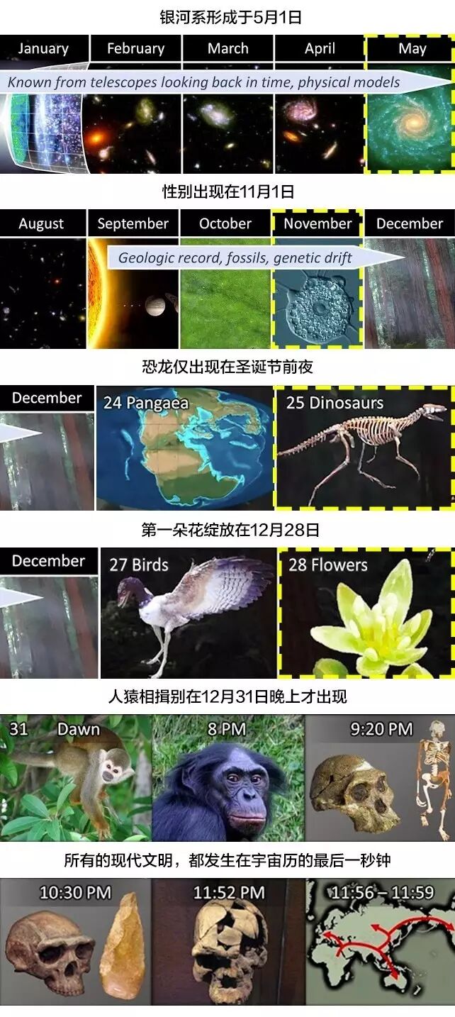 第一步,我们设想把宇宙的150亿年压缩成一年的时间。