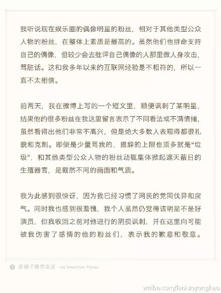 昨天,罗永浩在微博发布致歉信称,向之前讽刺的某明星表达歉意和敬意。并表示,惊讶于其粉丝在表达不满意时的礼貌和克制,没有他所习惯的网民中的党同伐异和戾气。