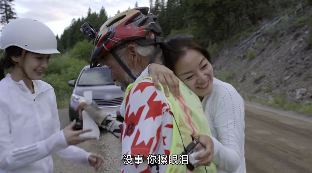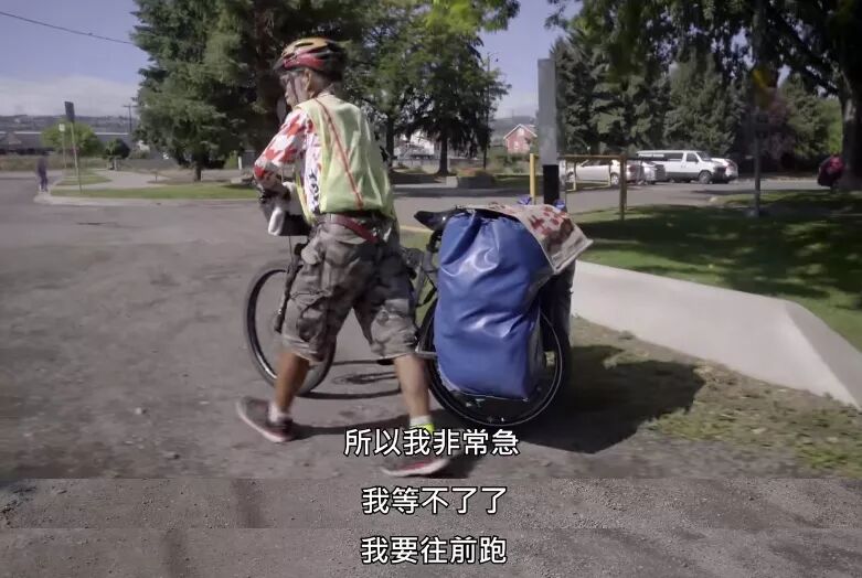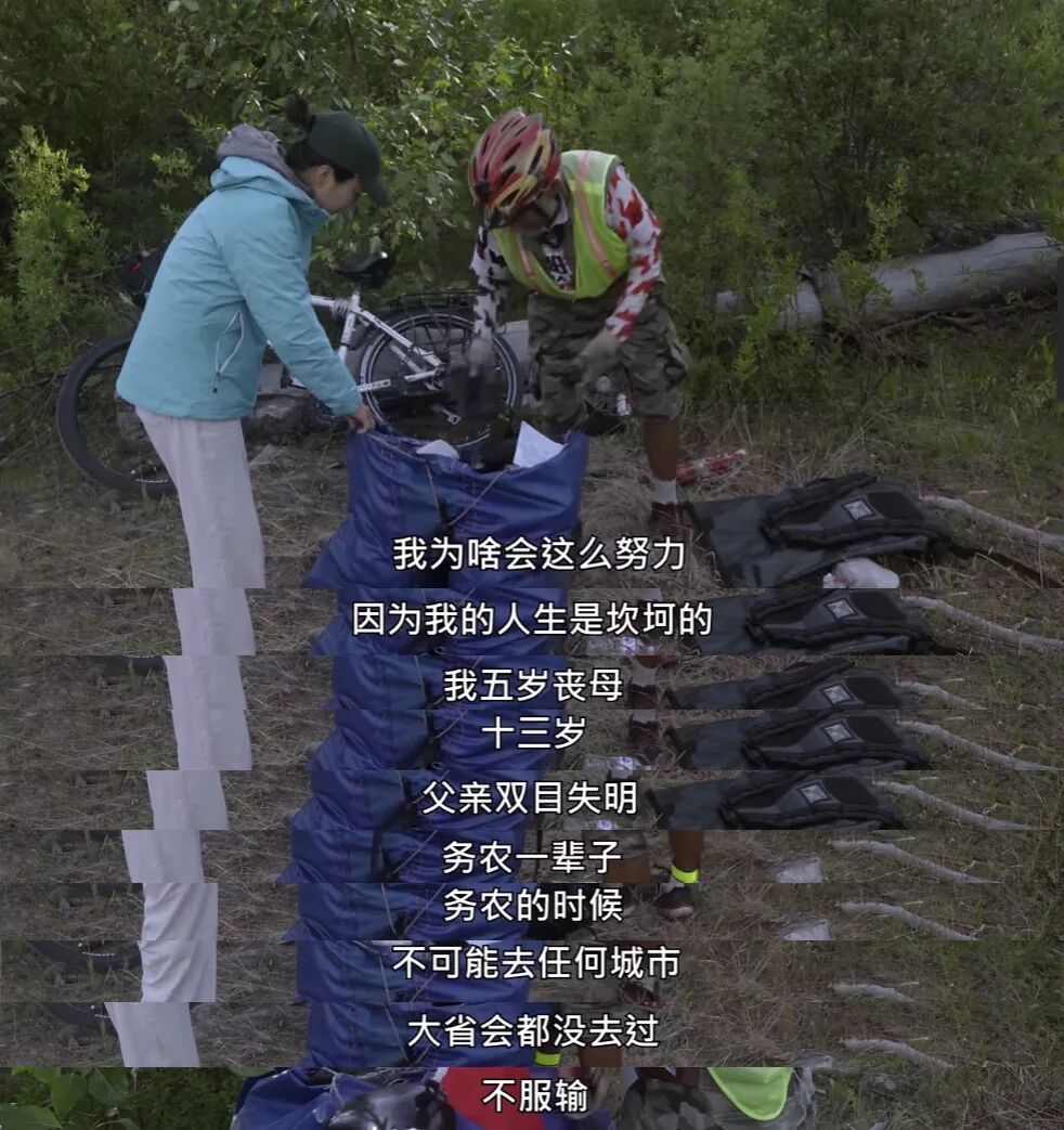 在和老徐聊天的时候,她又引导老徐说出了自己的身世:老徐父母早逝,很小就失去依靠,一辈子务农撑起一个家,面朝黄土背朝天过了一辈子,从没出过远门,连省会都没去过,直到61岁才有机会出来看看。骑行对他来说,不仅仅是看风景这么简单,还是他自我证明的一种方式,所以他才会如此执拗。