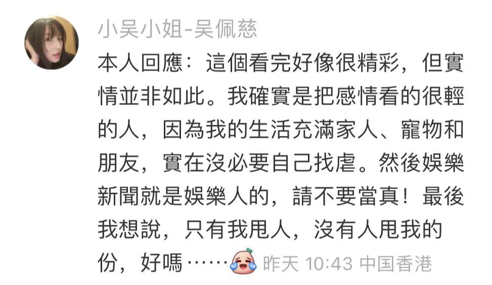 尤其是每次豪门有什么风波出现时,吴佩慈总要第一时间出来回应、澄清。