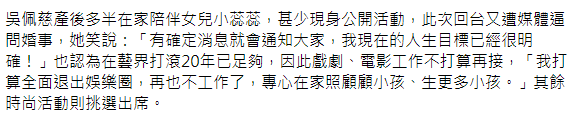紧接着,在产后首次公开亮相中,吴佩慈突然宣布全面退出娱乐圈。