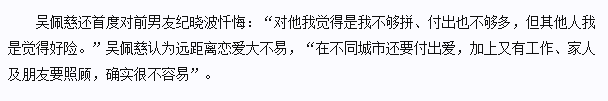 当时的媒体报道说:吴佩慈首度对前男友纪晓波忏悔,自认在感情里付出不够多。