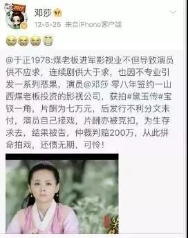 与此同时,她的签约公司开始趁火打劫,不仅拖欠她参演《黛玉传》7万元的报酬,还要问她讨要200万解约金,这对于刚有孩子的邓莎来说,简直是灾难。
