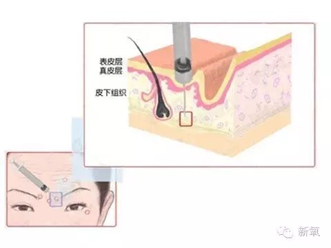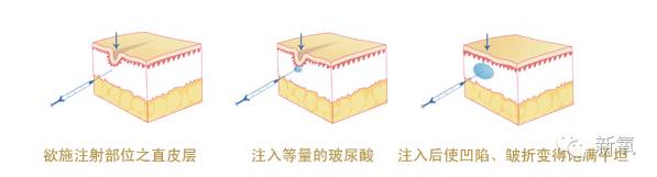 玻尿酸除皱原理:玻尿酸注射到你有皱纹的真皮层中,能将皱纹的沟壑填平,同时刺激那里的胶原蛋白新生,你的皱纹就没有啦!