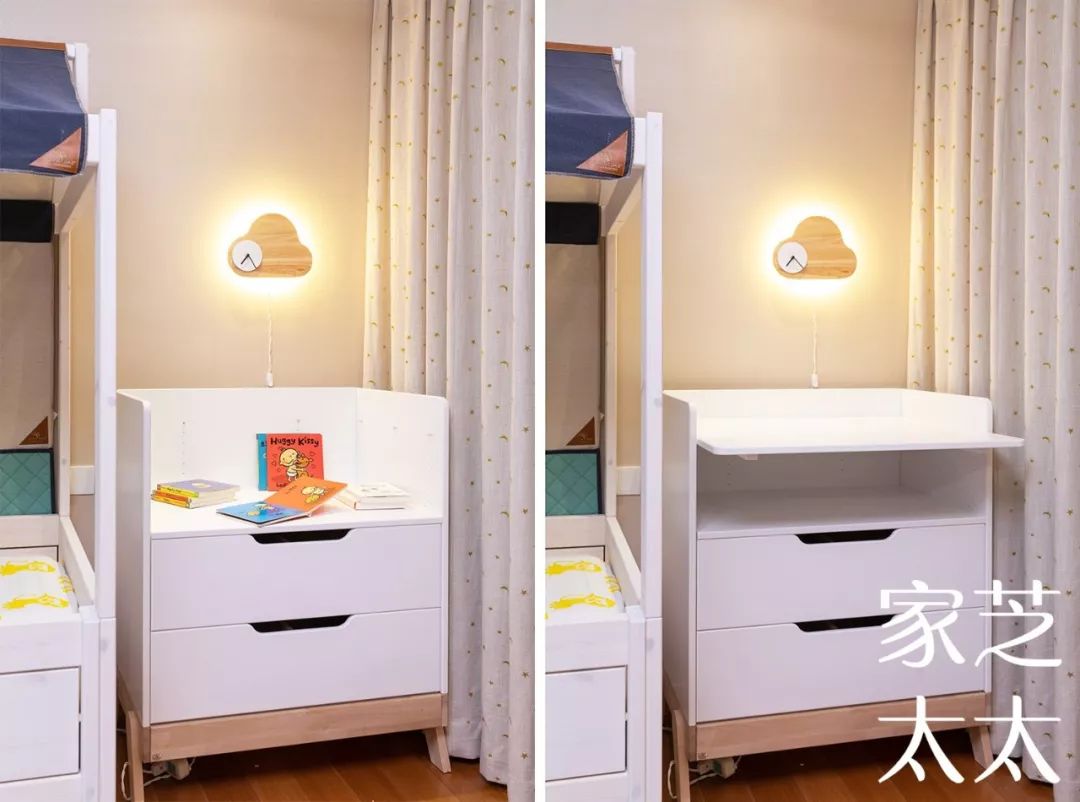 这个床头柜也能成长,婴儿时期它可以承担专门的换尿布台的功能,儿童时期他又能变成小书桌,而且还可以随着孩子的身高调节高度。平时孩子不用它的时候,它就是一个默默奉献的储物柜,可以收纳很多常用的轻便的衣物。(具体操作快戳视频吧~)