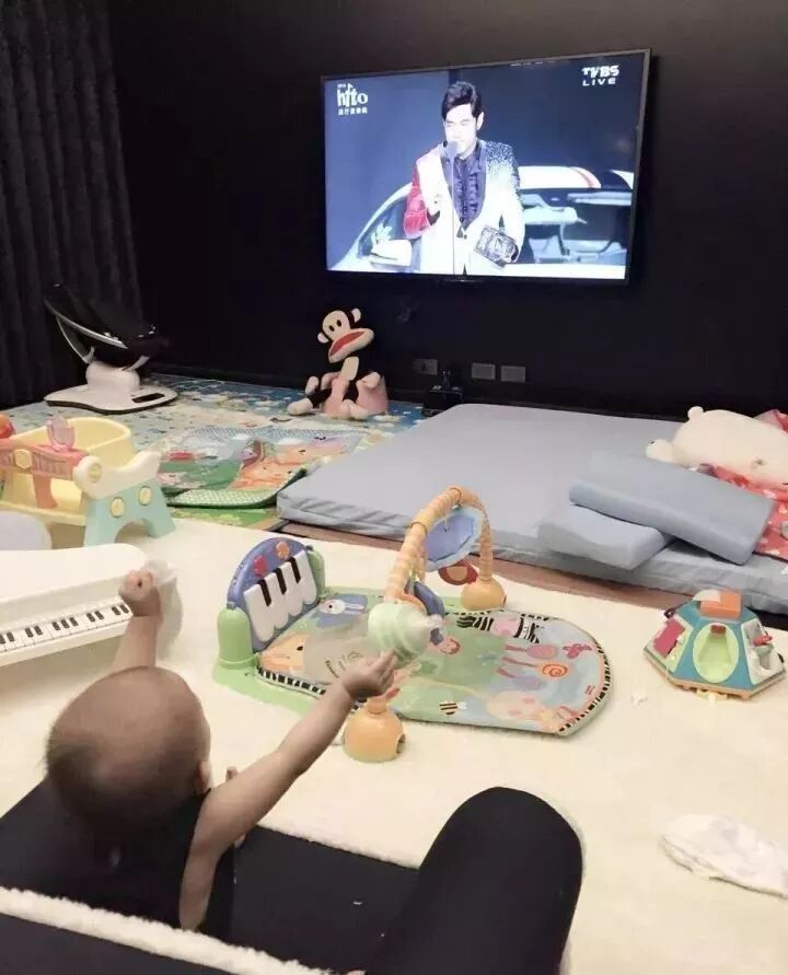 再来看一个正面案例:你看周董家的儿童活动室,完全是为小婴儿量身定做的,婴儿床+爬行垫,再摆上一些孩子可以抓可以玩的小玩具,孩子自己能玩很久。