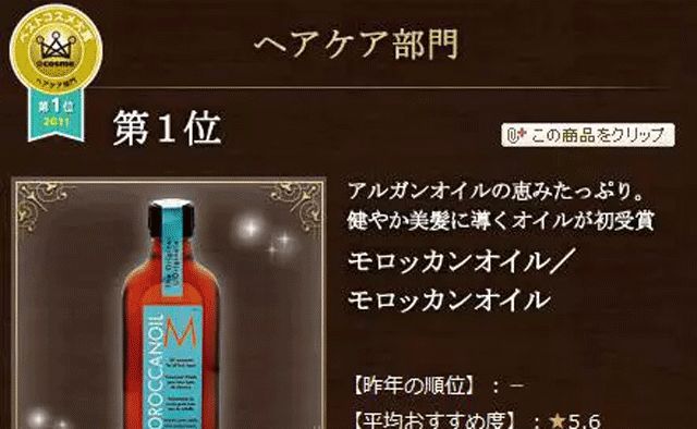 被网友们戏称为美发届的印度神油,对改善头发干燥、脆弱、分叉以及滋养头皮加强头发弹性有着神奇的功效,在2011年COSME大赏中更是获得了发膜部门的第一名。。。