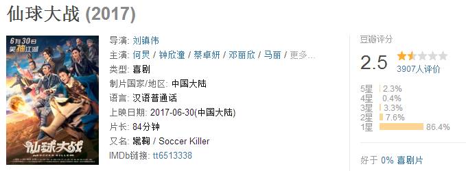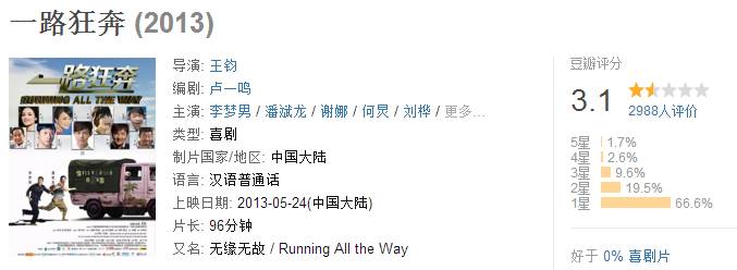超过5分的屈指可数,最高《暴走神探》5.3,最低《201413》2.4,真的不能再更低了……听说吴昕和杜海涛这两位“演技佼佼者”的《看见我和你》票房最惨,惨到只有3万,不过这次海涛的《爱的帕斯卡》应该是刷新纪录了……