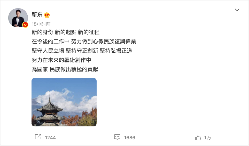 在2021年即将结束的时候,45岁的靳东又将在新岗位上履行新使命。