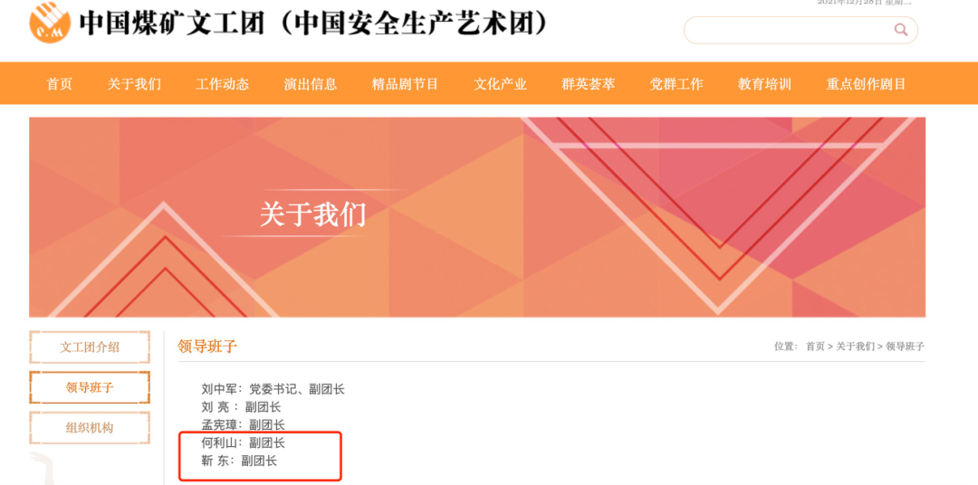 在煤矿文工团的官网上,领导班子的页面已更新,副团长名单中已更新了靳东和何利山的名字。