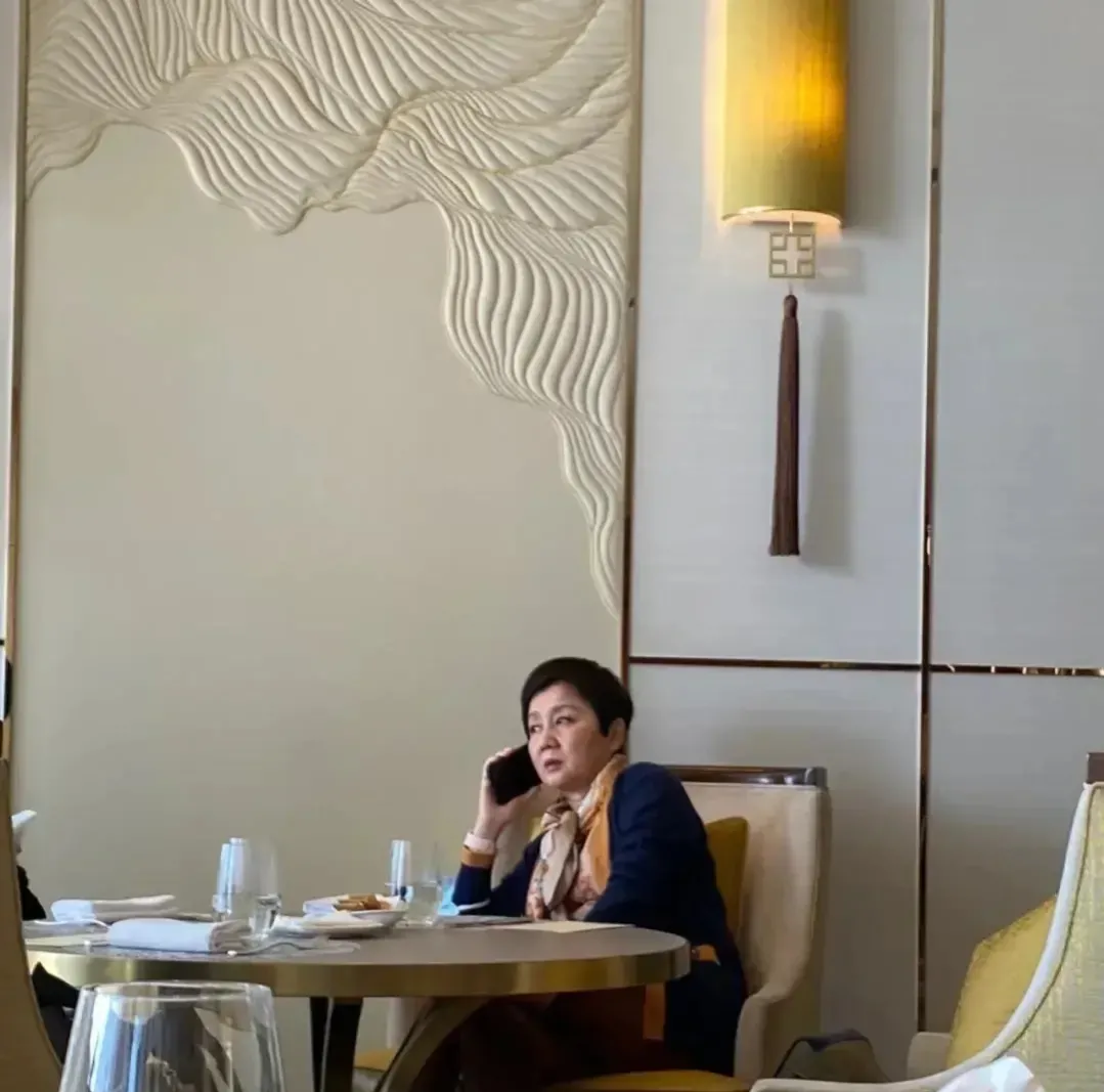 穿着一件黑色的上衣类,里面搭配的是那种灰色的小裙子,看起来还是非常的不错的呀,虽然说她年纪大了,有时候打扮的其实还是挺好看,而且也显得整个人看起来也是更加的美。