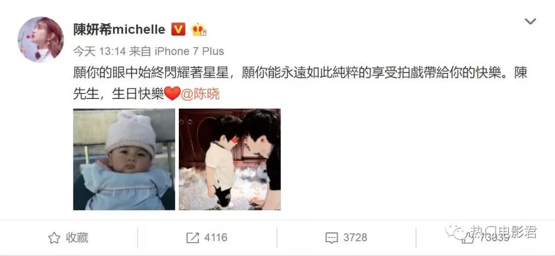 文/热门电影君(原创文章,谢绝转载,侵权必究)7月5日,台湾人气女演员陈妍希发布了一条微博,并配文“愿你的眼中始终闪耀着星星,愿你能永远如此纯粹的享受拍戏带给你的快乐,陈先生,生日快乐”,并艾特了老公陈晓。