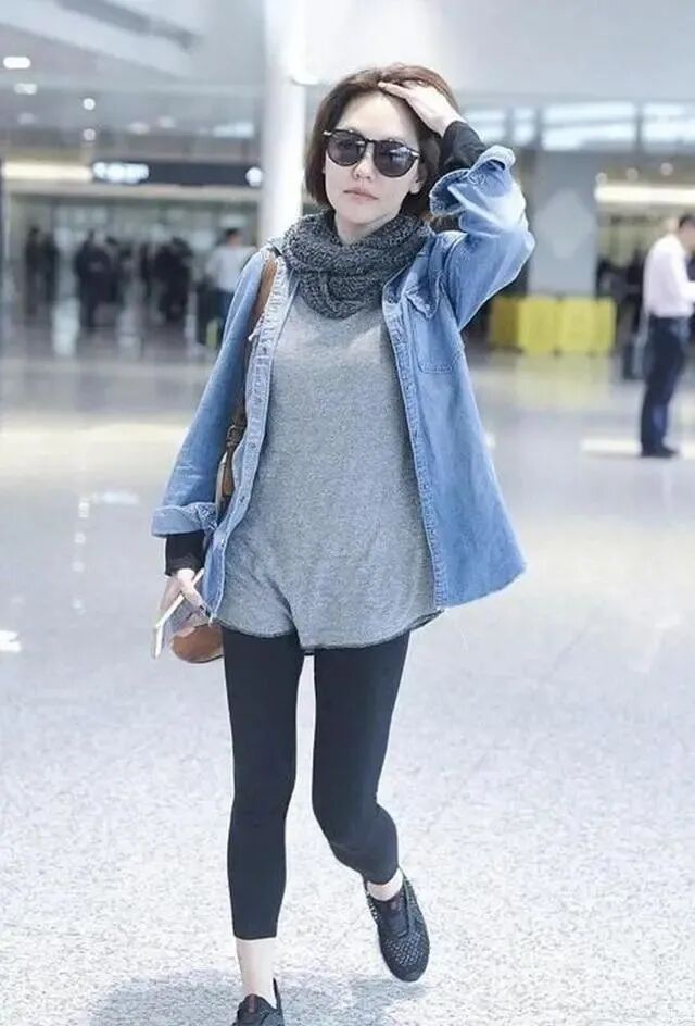 牛仔外套有很多种穿法,像徐熙娣这样搭配t恤就很不错,下半身的黑色打底裤也可以修饰她的小细腿,看上去温柔又保暖,这种简约风的服饰适合日常穿,秋季也可以学她搭配上围巾,丰富整个造型。