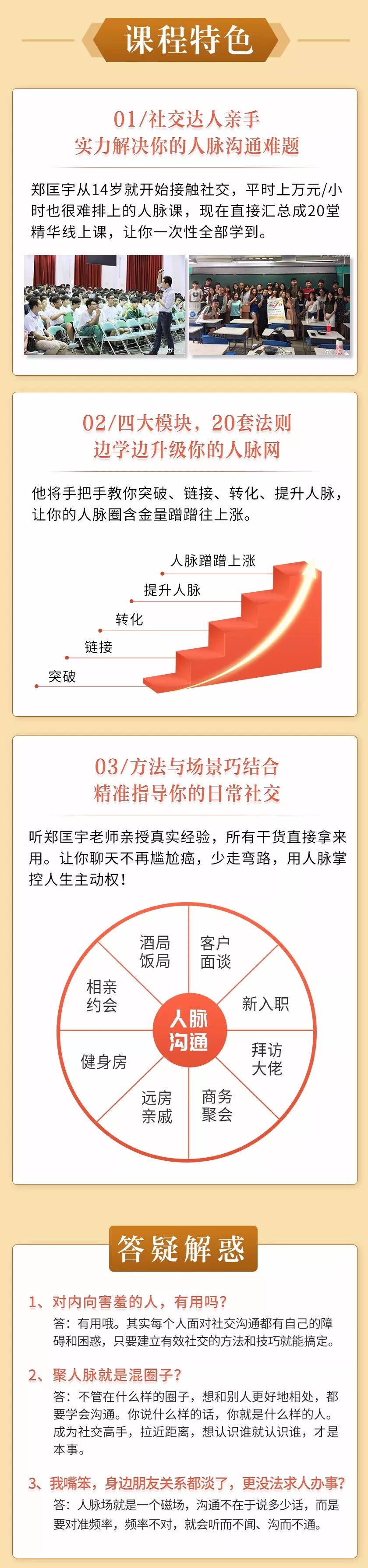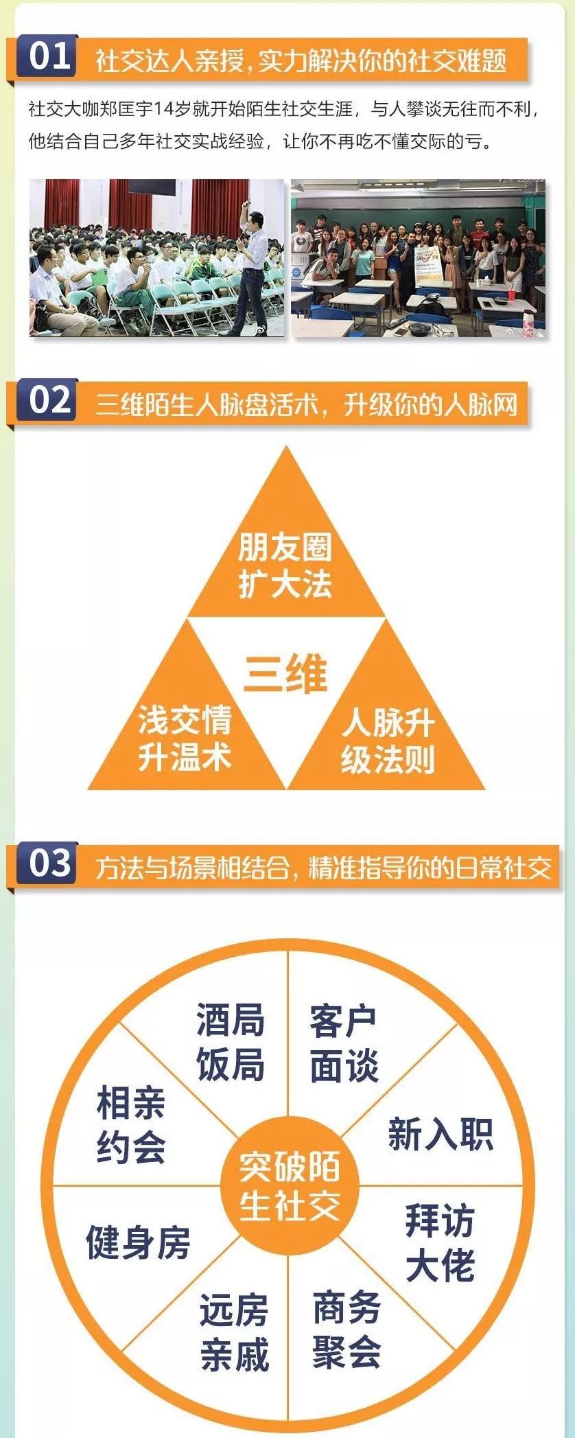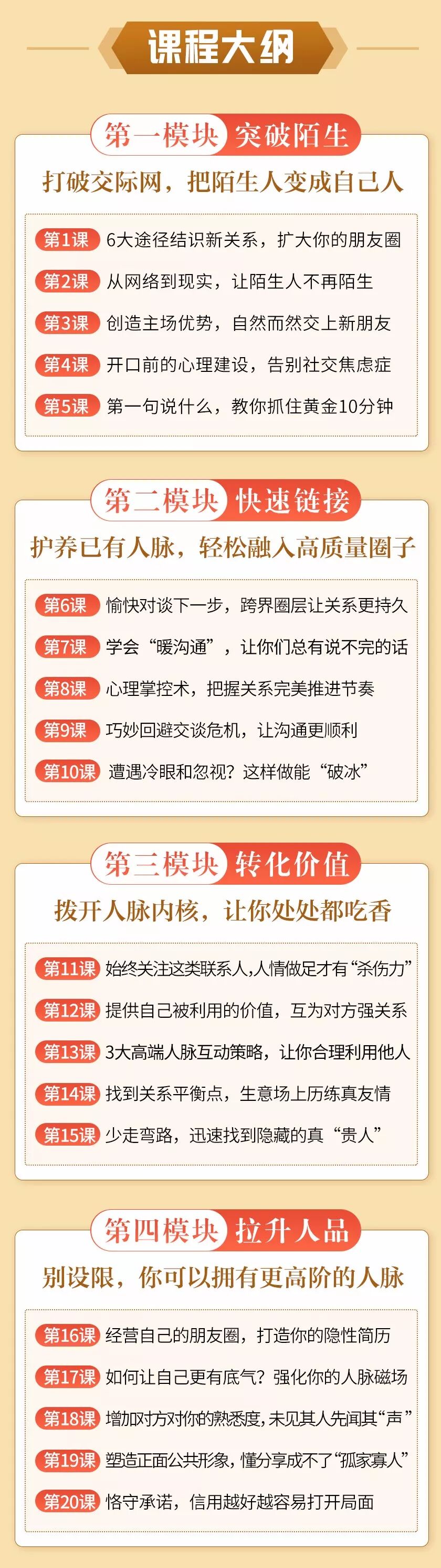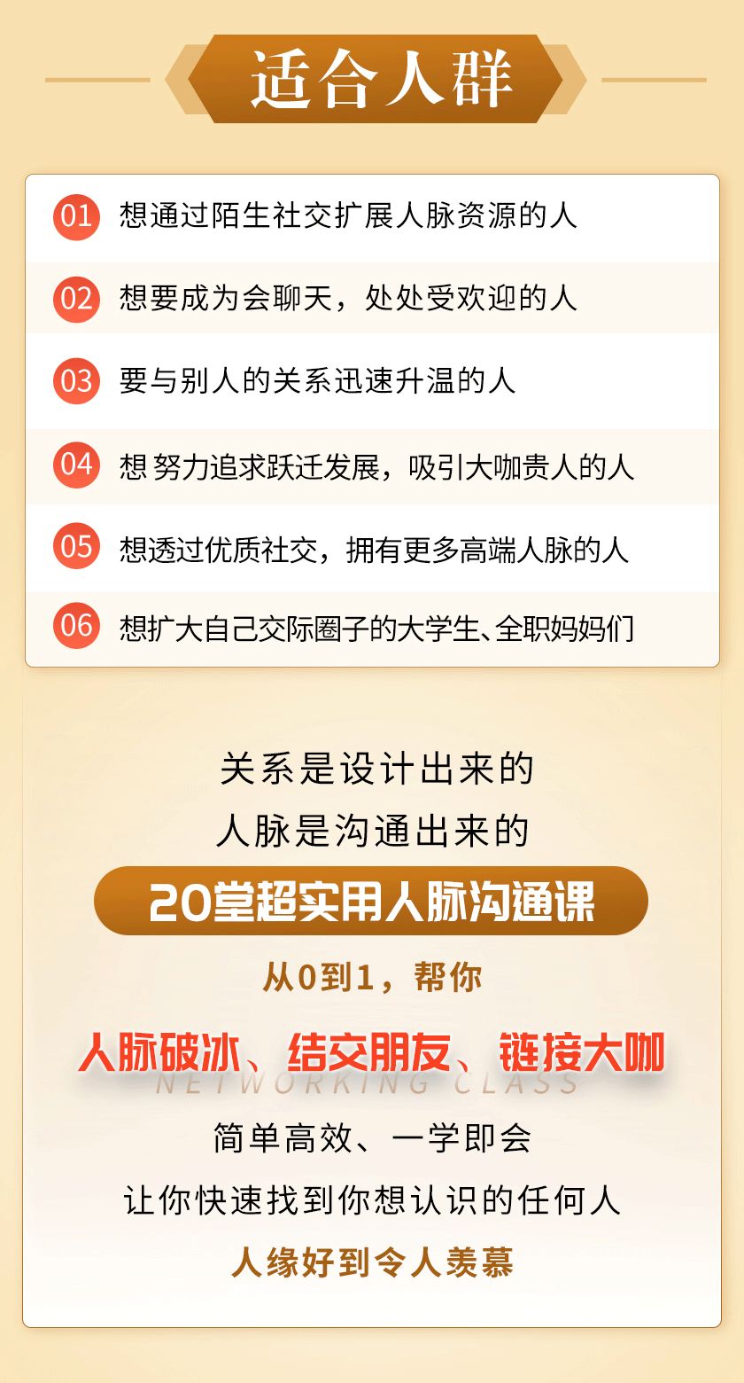 18节陌生社交人脉盘活课,2节生活工作场景应用社交课,从最基础开始,让你从此应对社交如鱼得水,成为朋友圈里的“人脉王”。