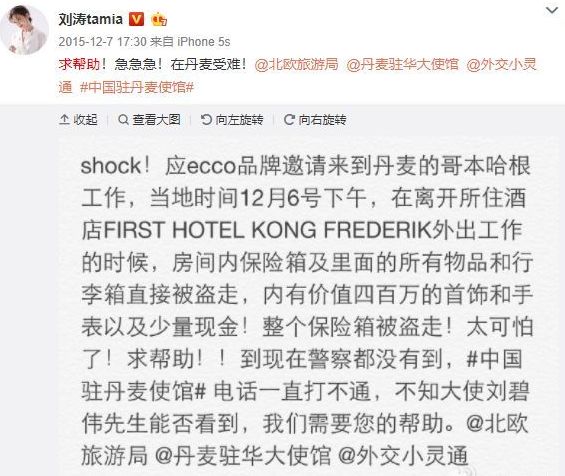 2015年,女演员刘涛在丹麦意外遭窃的消息刷爆网络:房间保险箱整个被盗走,内含价值400万的珠宝,但联系不到大使馆。