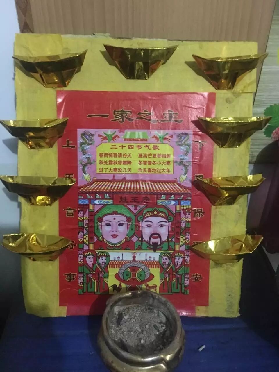 年近三十,神灵也在过年。年前,家家户户都要把各路神灵、祖先牌位恭恭敬敬地请出来,小心供上。屋里的锅灶上摆着灶王爷,一块A4那么大的硬纸壳上面贴着腊月里早早就从货郎那儿买好的灶王爷的画像,画像周边贴着“上天言好事,回宫降吉祥”的字样,除夕时还要在灶王爷旁边放上事先蒸好的“枣山”(一种像金字塔一样的面塑,上面整齐排列着大枣,二月二的时候吃掉)。另外一间比较清净的屋里摆放着写有“天下财源主,人间福禄神”的“财神爷”神位。在院子的窗台上放着“天地爷”,上面写着:“天恩深似海,地徳重如山”。院门口就是土地爷了,“土地门前坐,保佑一家人”。祖先的排位一般也要提前写好,摆在我们吃饭屋里最显眼的桌子上。上面写着“祭显考、祭显妣”等等故去亲人的字样。因为我会写一点毛笔字,母亲为了鼓励我,每年这些小对联,便成为我洋洋得意显摆幼稚书法的战场。