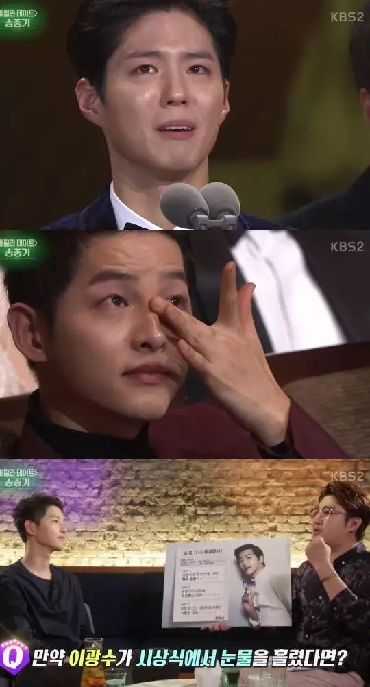 主持人提到了至亲弟弟朴宝剑获得演技大赏时宋仲基流泪的事,问道:“如果当时是李光洙得奖了,你也会哭吗?”