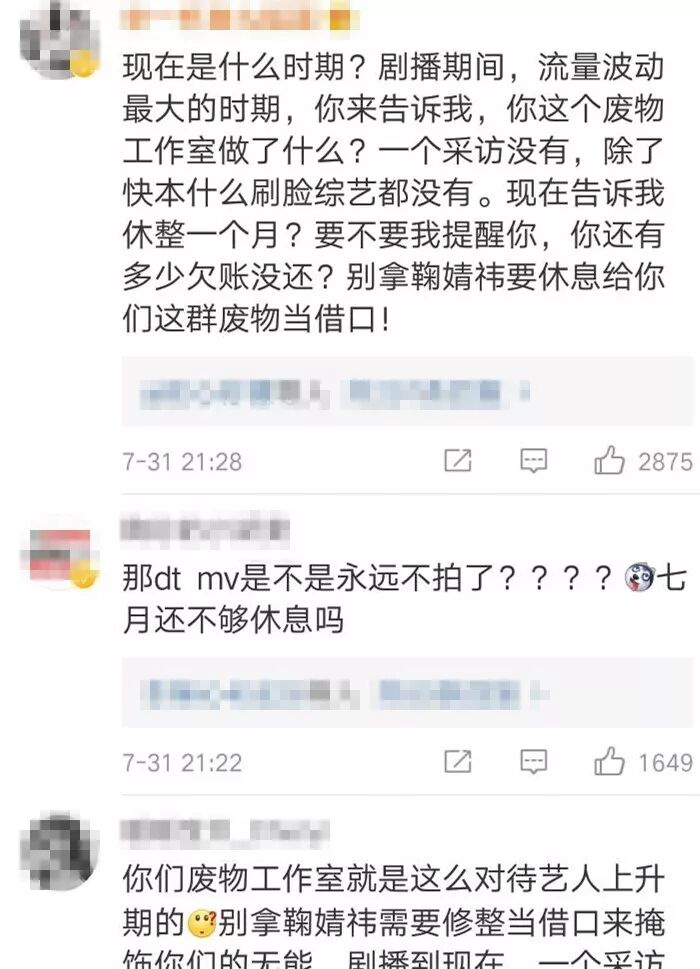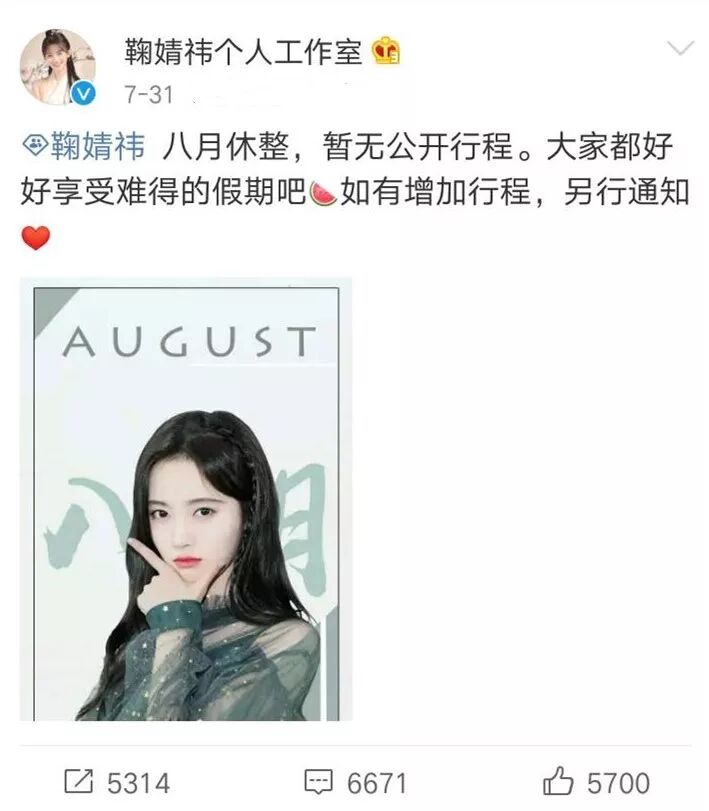 就在最近,鞠婧祎个人工作室宣布八月休整,享受假期的消息,小编初看觉得没什么问题的,但是当我看到网友评论的时候忽然瑟瑟发抖。