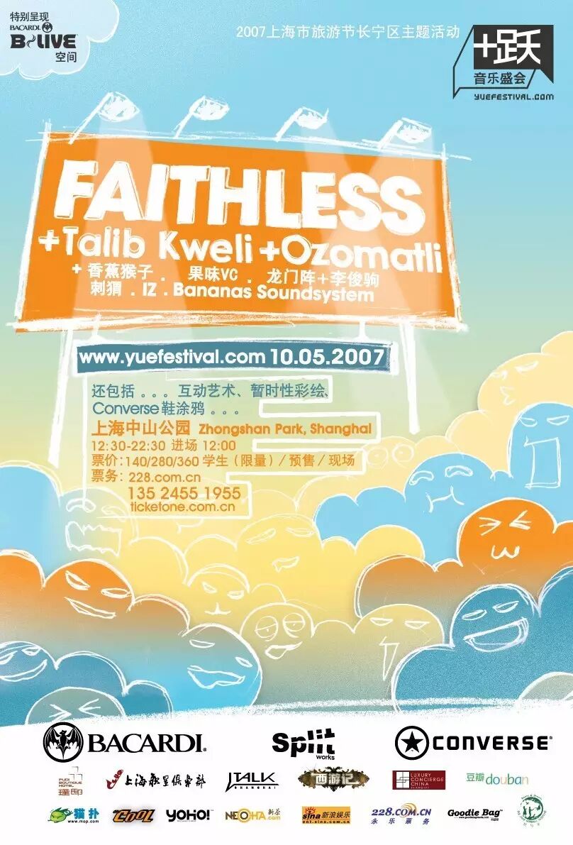 2007年是被许多歌迷铭记的一年,当年的4月他们邀请到了音速青年乐队(Sonic Youth)来华巡演,这对中国现场音乐发展具有重要意义的事件。2007年的票价是380元和580元但上海音乐厅的票早已是一票难求了。而十月是开功的第一个音乐节盛会Yue Festival!在短短一年的时间里为国内的音乐爱好者奉上了一场又一场的精彩演出令人瞩目。