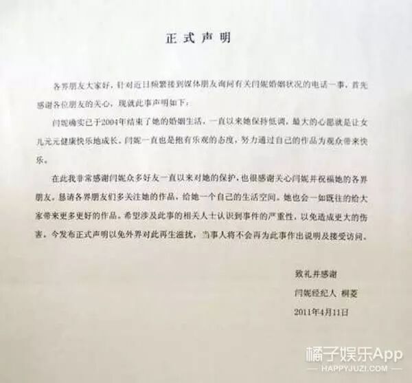 不过有点遗憾的是,俩人的感情没能长久,2011年,闫妮经纪人发声明表示闫妮已经恢复单身,而实际上,她和丈夫早在04年就办理了离婚手续: