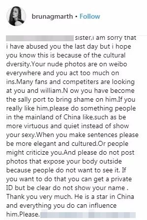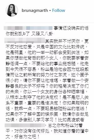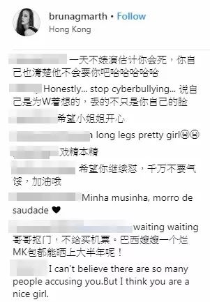 Bruna Marth自从被发现系陈伟霆嘅女朋友之后,佢嘅IG就不停被粉丝攻击,大部分都系话佢唔要面、做得人哋女朋友就要收敛下、点解陈伟霆会拣佢啊等等,而大部分嘅留言都系用简体字,真系唔知Bruna睇唔睇得明呢?