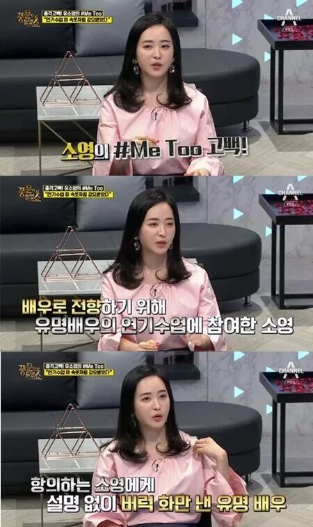 关于在韩国演艺圈愈演愈烈的Me Too运动,近日AfterSchool出身的演员刘小英在节目中讲述了自己的亲身经历:我之前为了向演员转型,曾经上过一个很有名的演员的表演课,在课上那个有名的演员老师让我们把上衣卷成内衣的样子,并且让男女生面对面紧挨着站立。我说我做不到,他生气地说“别人都能做你算什么为什么不做”,在我坚持说做不到的时候,他说做不到就出去,最终我哭着跑了出去,跟公司说再也不去那上课了。即使已经过了几年那个老师依然活跃在演艺界。节目播出后,这个有名的演员到底是谁?引起了很多人的猜测。