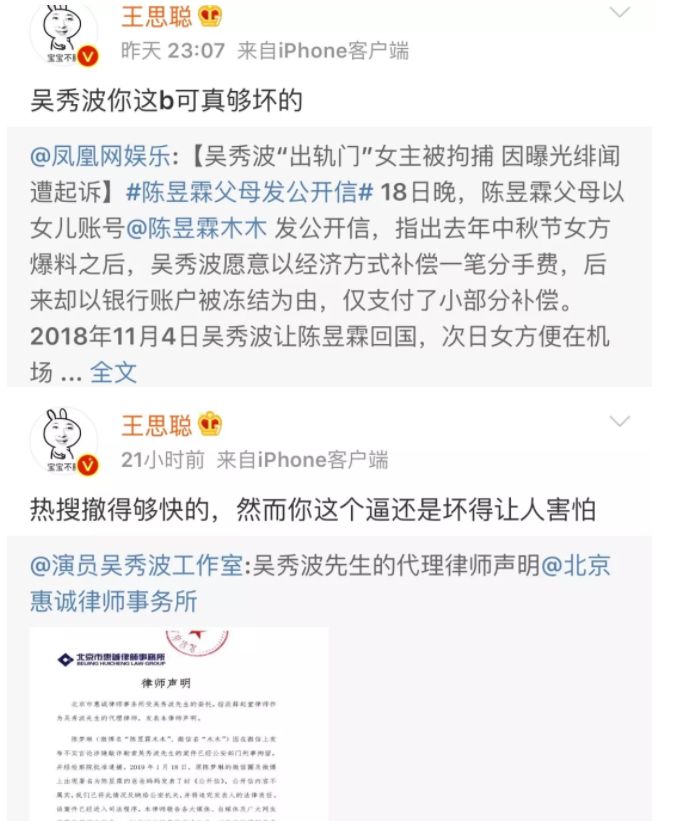 这么大的事王思聪肯定会“插一脚”,果不其然,吴秀波出轨的瓜,让王思聪连发几条微博。