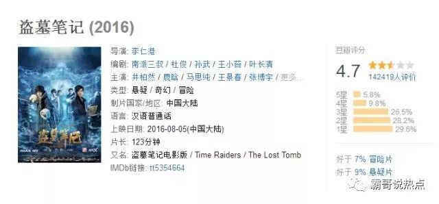 两部捉妖记帮井柏然拉起46亿的累计票房,然后又遇上了经典小说《盗墓笔记》,《盗墓笔记》的IP和粉丝有多强大,看着4.7评分的《盗墓笔记》还有10亿票房就该知道,只要制作精良超过《寻龙诀》那是简单的事情。