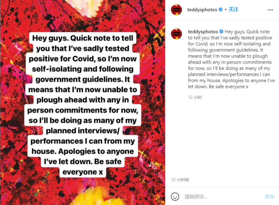 他说:“我只想告诉你们,我新冠检测呈阳性,目前我正在遵守政府的指导安排,进行自我隔离之中。这意味着我现在无法完成已经安排的工作和日程,因此我将尽可能在家里进行计划中的采访和演出。我令大家失望了,我对此道歉。每个人都要安全~”