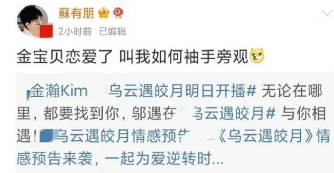 没过多久,苏有朋发博为金瀚的新剧打call时,两人一来一回的互动,被网友解读成苏有朋疑似在内涵张智霖“赢得不光彩”。(事后苏有朋已经第一时间删除了这个耐人寻味的评论。)