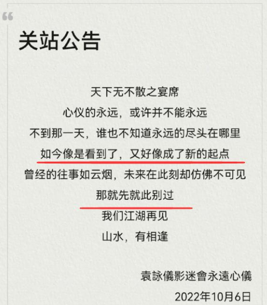 至于关站的原因,影迷会没有给出说法,不过字里行间引人遐想。