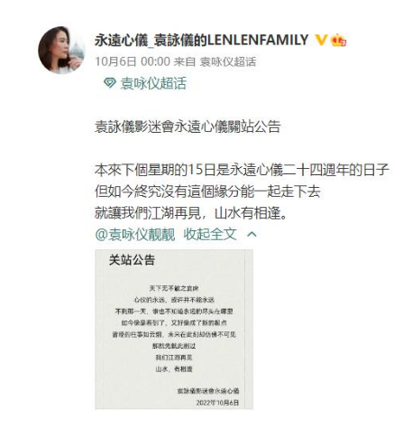 10月6日,袁咏仪影迷会发布关站公告,引发网络热议。