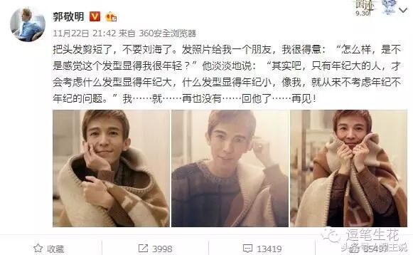 在这条微博中,小四发了三张自己的自拍照,调侃自己不再考虑什么发型显得年纪大,什么发型显得年纪小。而网友也是纷纷表示“这难道不是陈学冬的语气”?