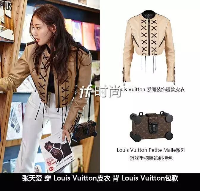 ▲Louis Vuitton 系绳装饰短款皮衣,搭配白色修身直筒裤,包包是Louis Vuitton Petite Malle系列游戏手柄装饰斜挎包。有点科幻儿童的feel~