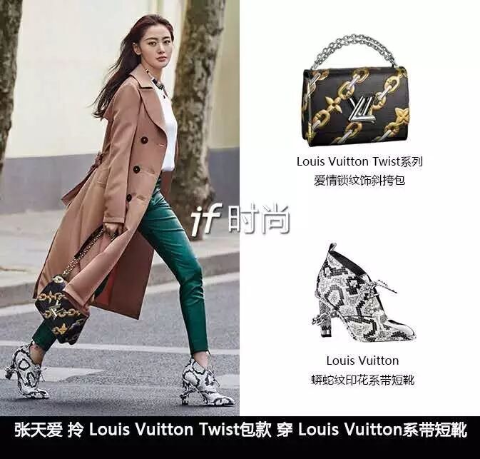 ▲Louis Vuitton 系带双排扣风衣,搭配蟒蛇纹印花系带短靴,包包是Louis Vuitton Twist系列爱情锁纹饰斜挎包。