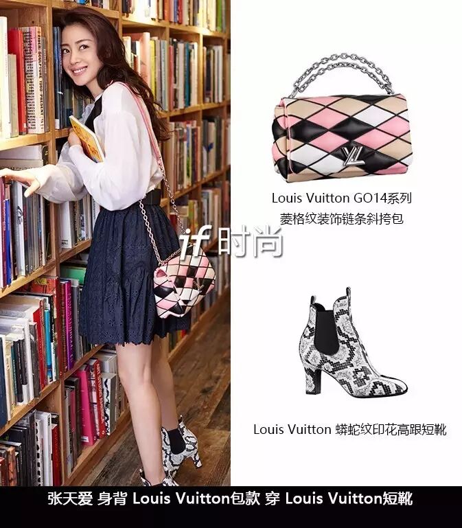 ▲上衣和短裙来自Louis Vuitton ,身背Louis Vuitton GO14系列菱格纹装饰链条斜挎包。
