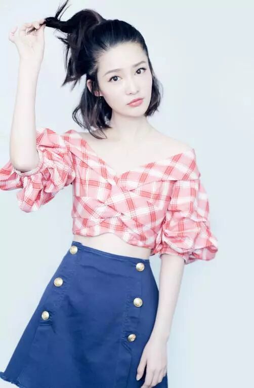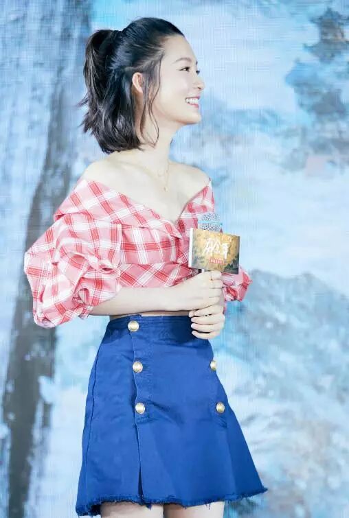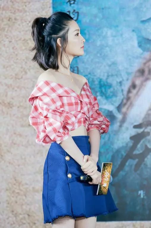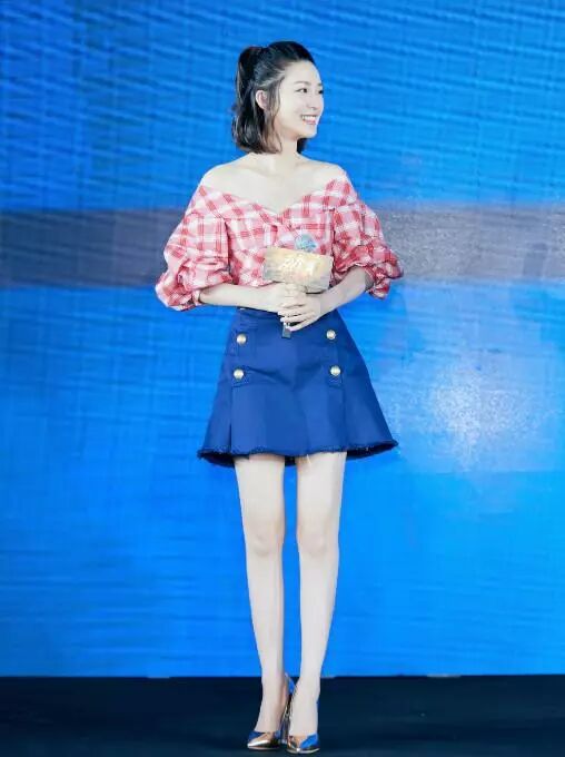 李沁身穿一字肩粉红色方格上衣,露出迷人香肩,搭配深蓝色短裙,裙身用金色排扣装饰,露出性感美腰,真是迷死人了。
