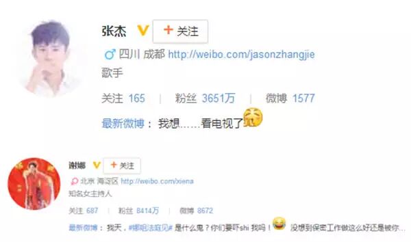 张杰和谢娜的微博粉丝合计1亿2323万。