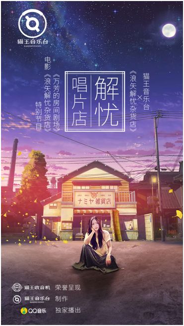 最后,正所谓:“何以解忧、唯有音乐”。猫王收音机联手著名音乐人万芳,在QQ音乐官方平台,独家打造了一档暖心节目——《万芳的房间剧场@#浪矢解忧杂货店#特别节目:万芳解忧唱片店》。万芳用娓娓道来的声音,说出人生的爱与情、乐与愁,用音乐来达到“解忧”的目的。