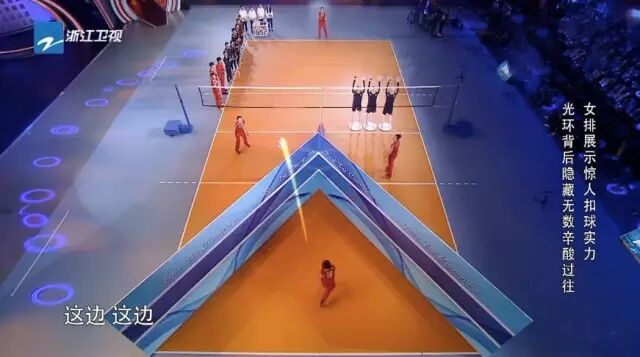 在能力展示环节中,女排姑娘们在排球场地被Y字形挡板阻隔起来,互相看不见的情况下发球、传球,扣球击打木头人。在郎教练指导下,冠军队用熟练的打法和惊人的速度成功扣杀木头人。