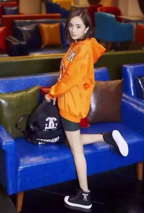 橘色宽松款卫衣搭配纯色运动短裤,黑色平底鞋与双肩背包打造运动少女风,纤细匀称的大长腿就这么完美的展现出来啦。
