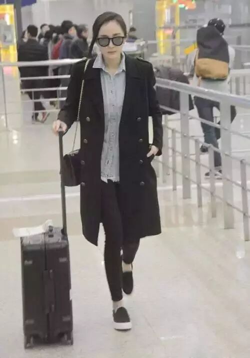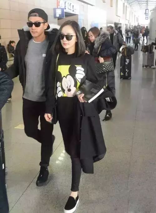 黑色可是怎么搭都不会出错的颜色,大幂幂和刘叔叔一起现身机场,长款黑色米奇卫衣,黑色小脚裤,黑色乐福鞋,简单也能很时髦。