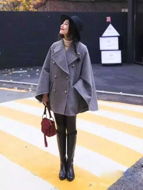 略带军装风的灰色斗篷外套+黑色直筒长靴,手提酒红色流苏包,增加了搭配的优雅大气。