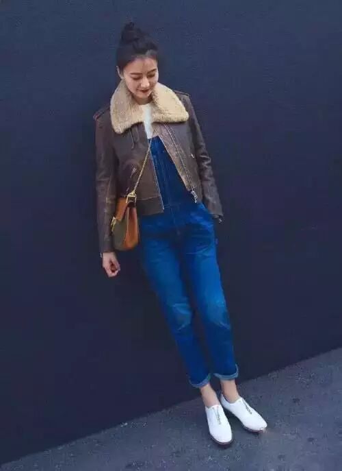 机车服一直给人帅气的感觉,搭配亮蓝色减龄背带裤,脚踩小白鞋,中性范十足,但是其中又透露着一点俏皮。