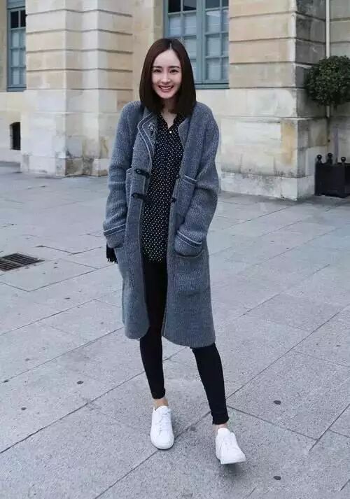 减龄的毛衣外套搭配衬衫和黑色小脚裤,小白鞋,韩范十足,满满地少女气息。