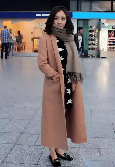 冬天怕冷怎么办,及踝大衣可是个不错的选择,裸色大衣简洁又时髦,优雅大气,是妹子们不用担心会过时的必备单品,话说大幂幂的这条围巾,据说因为她一度卖到了断货的地步。