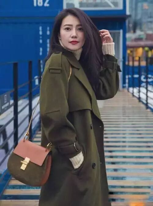 军绿色呢子大衣+混色链条单肩包,内搭今年大热的米色高领毛衣,保暖又时髦。